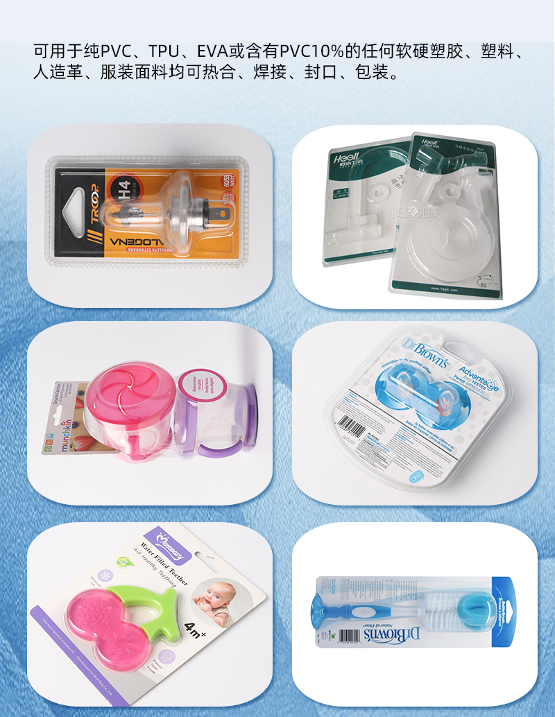 1.用途:可用于纯PVC、TPU、EVA或含有PVC10%的任何软硬塑胶、塑料、人造革、服装面料均可热合、焊接、封口、包装。