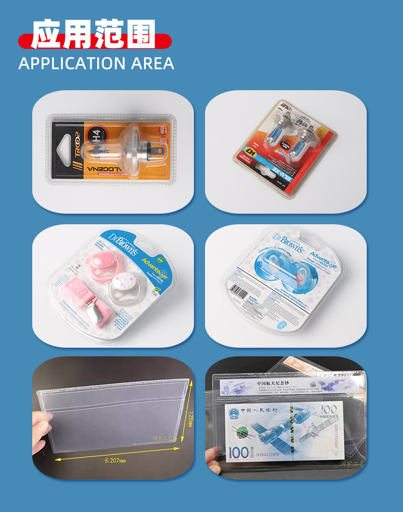 主要适用于APET、PETG、GAG环保材质的双面吸塑泡壳的封口包装、吸塑纸卡包装、牙刷封口包装,以及EVA布类皮革、真皮、OPP、PU、表带、吊带、热水袋、保暖袋等需要熔接又要同步熔断的产品,一面吸塑罩泡壳和一面纸卡的封边封口切边贴合,一次成型没毛边,边缘光滑。