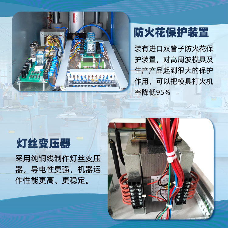 汽车脚垫单边推盘高周波机高灵敏度进口双管火花保护装置,能有效保护模具及产品的缺损,从而大大减少烧坏模具的机率,采用国际大品牌原装OMRON(欧姆龙)继电器及台湾正宗CKC时间制,能保证机器长时间的频率工作,并大大延长机器寿命,减少机器故障。